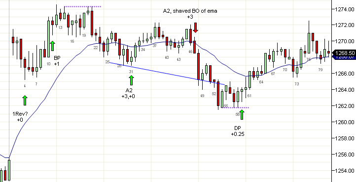 Una vez que tuvimos una pobre entrada en largo con A2 en la vela 40 que nadie tomó, la tendencia básicamente se terminó, y lo mejor que podemos hacer es esperar un rompimiento. Un rompimiento tardía de una DP en la vela 78 puede haber iniciado un rompimiento para una tendencia bajista que puede continuar en la siguiente sesión.