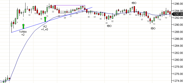 En un día de rango, cualquier movimiento de dos segmentos al otro extremo del rango puede operarse como si fuera una A2 (velas 31 y 46) aunque no sean estrictamente continuación de una tendencia. Una vez que la tendencia ha terminado en una dirección, el siguiente rompimiento puede ser en cualquier dirección, por lo que es buena idea entrar en cada movimiento de dos segmentos si se forma de una forma aceptable.