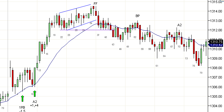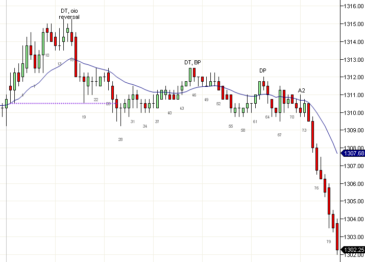 Una operación de DP (retracción de doble fondo o doble tope), que es por naturaleza una operación de alta probabilidad se desarrolló en la vela 63 seguida de una A2 en las velas 72 y 73. Observa que cada señal de corto decente desde la vela 16 tuvo éxito, por lo que la A2 era ciertamente candidata a una operación de swing.