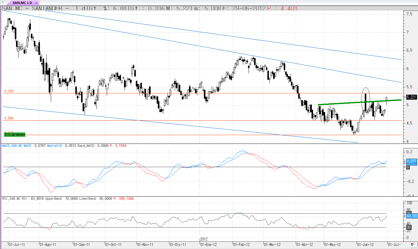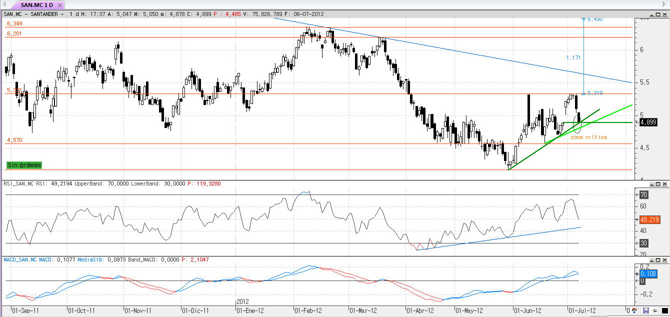 Llegaron a los soportes mencionados. En el caso del san me fijaré en el 4.44 si lo pierde se irá al 4.17-4, en caso de superar el 4.74 intentará de nuevo superar el máximo anterior relevante. En el caso del ibex, si pierde el 6480 se iría al 5987, mínimo anterior, en caso de superación del 6829 al 7232.
