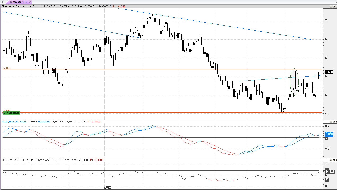 En cuanto al Ibex si es cierto que ha roto figura al alza de h-c-h invertido descendente, pero estoy cauteloso porque los valores grandes como san,bbva,rep etc, no han superado el máximo que se realizó el DIA 11 de junio, solamente telefónica lo ha superado por escaso margen; pero si obviamos este día, todos menos Repsol han roto figuras al alza y entonces sea un posible cambio de tendencia. La duda esta servida: ¿cómo actuar en estos momentos?.