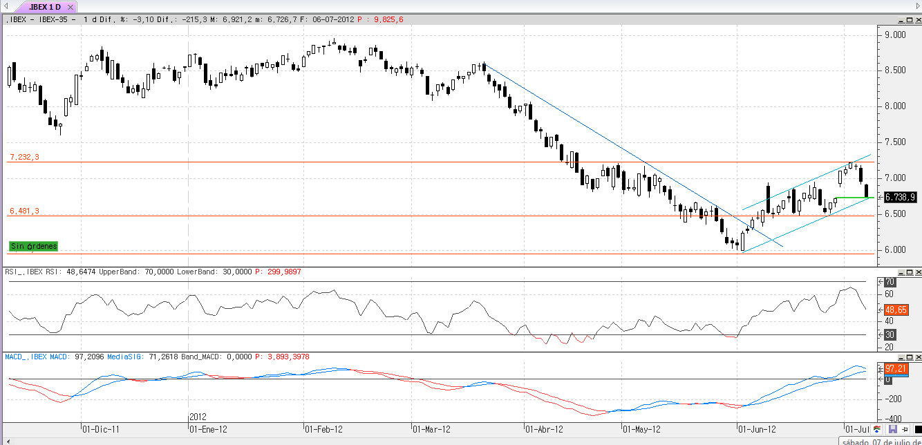 En cuanto al ibex la situación se presenta más “sencilla” pues no tiene margen, es decir, la perdida del mínimo del viernes le llevaría a al 6481, en caso de perdida de este nivel lo más probable que se fuera a mínimos otra vez; si se mantiene se podría ir al 7235.