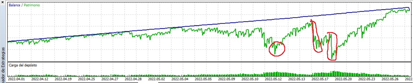 señores buen día , manteniéndolos al tanto de los acontecimientos, la cuenta manual esta aun en perdida no he logrado ponerla en nivel siquiera , pero aun esta viva y con capital suficiente ,estaba publica pero al no operar por 20 días la han quitado de mql 5, no sabia eso entonces no puedo poner la imagen de como va por ahora, luego la reactivo haber y les comento; pensaba hacer trade con acciones de Netflix y Boeing pero hubiera sido fatal, afortunadamente decidí esperar y caramba me han salvado de una perdida importante ustedes saben lo que paso , por otro lado el bot curiosamente empezó mal pero ha ido recuperándose, inclusive creo que ya esta algo en positivo, apenas con unos dólares por encima de lo inicial, la imagen es de un back test de como se comporta( como para poner algo ), sin embargo parece que entre preciso en los bajonazos que puede tener la cuenta, por ahora esta estable que es lo importante, esperemos poder seguir actualizándolos mes a mes de como marchan las cosas
