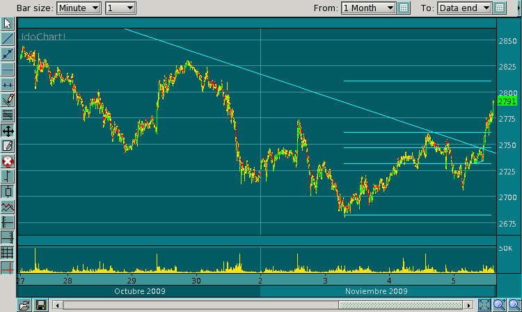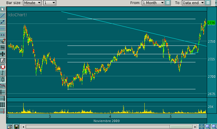 No bajamos con la contundencia que sería normal al romper una directriz tan importante, pero bueno, lo que cuenta es que se está formando una directriz bajista, parece que habrá que esperar al veredicto yankee. Lo que pase a las 16.00 será muy significativo, otro dato bueno y empapelada, será muy esclarecedor. De momento no hay gran fuerza bajista, ya veremos.