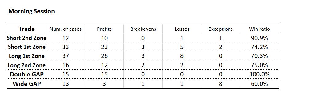Tal y como vine vaticinando, las segundas zonas son más probables, la razón principal es que cuanto más extendido es el movimiento, más probabilidades de reversión hay. Por otro lado, también son las zonas más rentables, pues el ratio riego/beneficio es mucho más alto que la primera zona. No obstante, es muy importante seguir las reglas, pues Georg establece una serie de limitaciones tanto a la hora de entrar, como por ejemplo esperar las reversiones, revisar en qué situación se encuentra el Dow Jones y sobre todo, las paradas por tiempo, ahí está la clave de su estrategia.