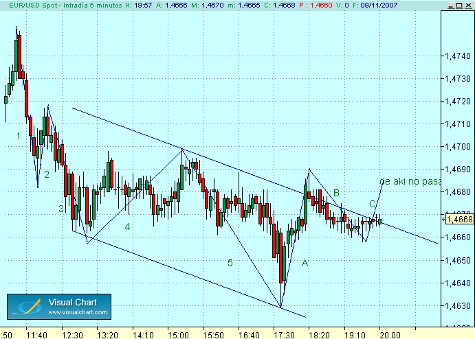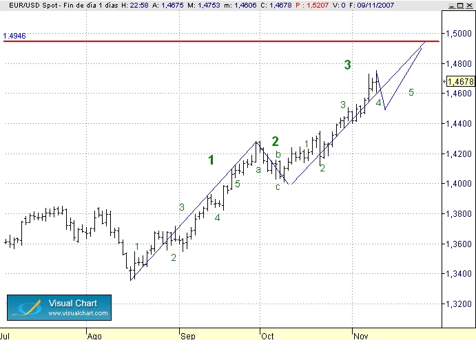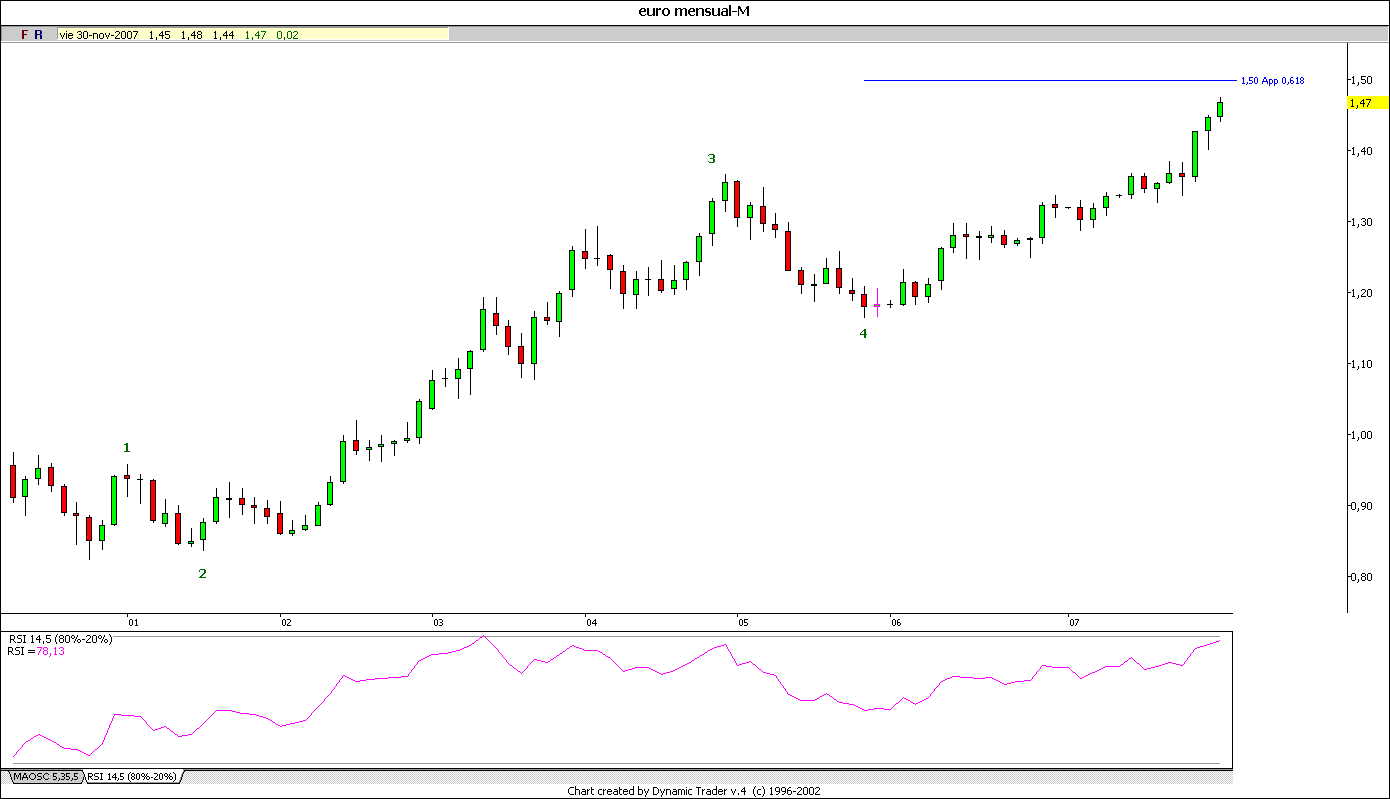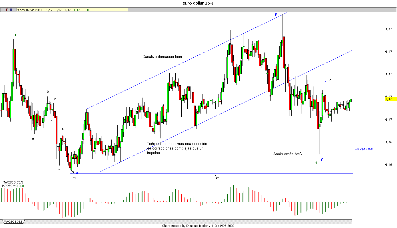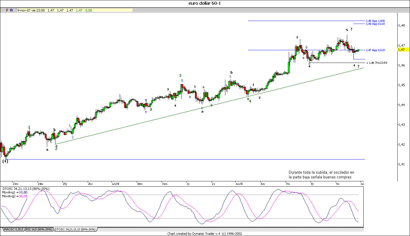 Pues Gofio, voy a redundar tu opi pa que te animes y no te sientas solo. El recuento del diario ta claro. Añadiría que el 1.47 es también la proyección de la 3 desde el final de la 4 de este impulso...¡tomaresistencia! amás estoy de acuerdo contigo en que puede ser la 5 de la 5 de la ..y ya me voy perdiendo contando cincos. Pa empezar el mensual: ahí ta tan claro como en el diario que estamos en la 5. Pa continuar el semanal, donde ya no ta tan claro :evil: pero puede ser que sí. El diario ya lo has puesto tú. Y nos queda el horario donde pa tocarlos un poco no ta claro si falta la miniquinta o no. De todas formas, en cuanto pierda el mínimo del otro día en el descenso repentino ese hasta 4635 o así, estará claramente terminada la 5. Y para alegrarte más te diría que mi recuento de los índices europeos pa estas semanas próximas es muuu bajista. U sea que atención.