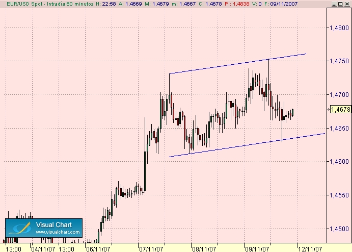 Así que no tengo más remedio que seguir de cerca el horario donde ahora quien manda ( aparte de los chinos) es este canal. Como a la baja no lo ha roto seguimos estando alcistas. Puede dedicarse a recorrerlo de arriba a bajo un par de días y descongestionarse y seguir subiendo o bajar. Si lo rompe arriba con claridad y con una barra grande que cierra por encima de éste ya no se para hasta el 49, así que a ver si sobre la marcha vemos algo más porque de momento, mientras no rompa la zona del 630 no hay forma de ver bajista esto, ni para un par de dias. En fin, que ójala no pase el 90 ni el 1,47... y baje al menos una figurilla más para que no haya sido todo casi en balde.