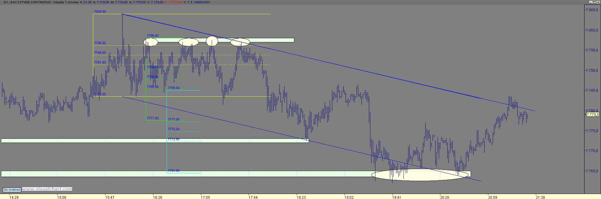 B noches tras la apertura Usa y la tombolo noticiera se superaron los maximos anteriores hasta el 7804 formando tras ello un impulso con retro extendido al 7798 zona de maximos anteriores que ha funcionado como un muro de contencion hasta que al final hemos caido llegando al obj del tercero 7764.50 formado por ese canal bajista desde maximos , no guardar las armas que mañana ya esta aqui Saludos