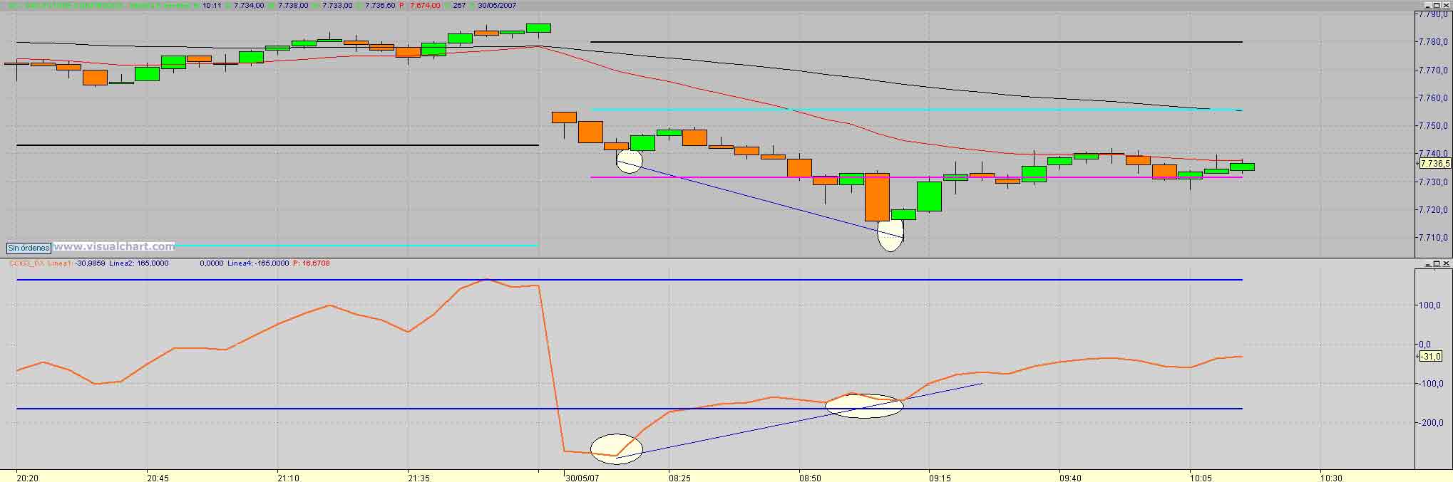 Buenos dias hoy nos despertamos rojillos, y confirmado por ese maravilloso pullback al 7749 punto de partida del segundo impulso que por desarrollo de estructuras nos llevo al 7708 , punto en el que el indicador marcaba clara divergencia alcista buscando en esos largos su media de 20 obj natural y ademas coincidente con elvel perdido del 7736 , apartir de ahi a buscar el retro valido para una segunda entrada y parece que esa zona 24 27 es zona de apoyo para ir a buscar cotas mas altas Saludos