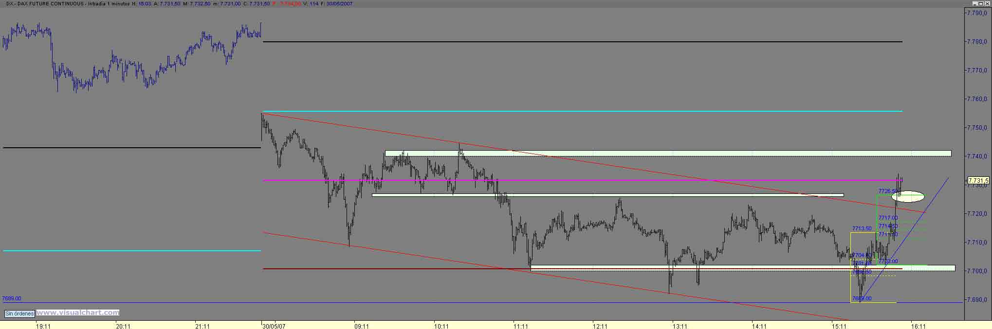 Muy buenos dias descansados deel largo puente bursatil nuestro amigo el Dax quiso reencontrarse a buscar sus amximos anteriores 7794 desde donde sin superralos se deslizo en tres impulsos al nivel del 59 61 coincidente con la direztriz alcista que traemos desde el doble suelo del 7674 donde tomar posiciones largas con obj inicial el 50 61 de Fibo de toda la bajada el 7775 80 y zona de control anterior Saludos