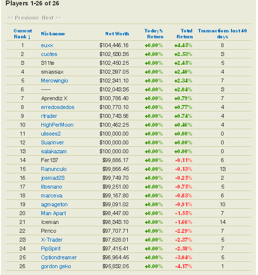 Además yo quiero seguir jugando, oficialmente soy el último entre los no descalificados, ya que Gordon y Optiondreamer han dejado operaciones abiertas durante el fin de semana y que quereis que os diga, me hace ilusión quedar el primero de la lista, aunque sea empezando por abajo.