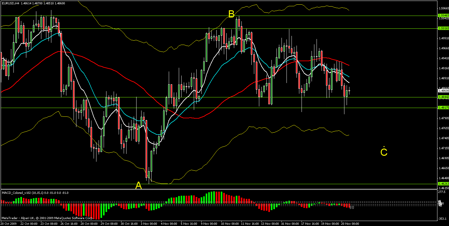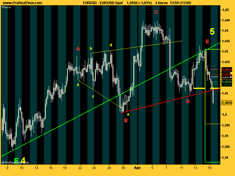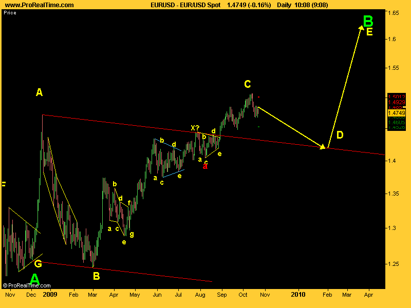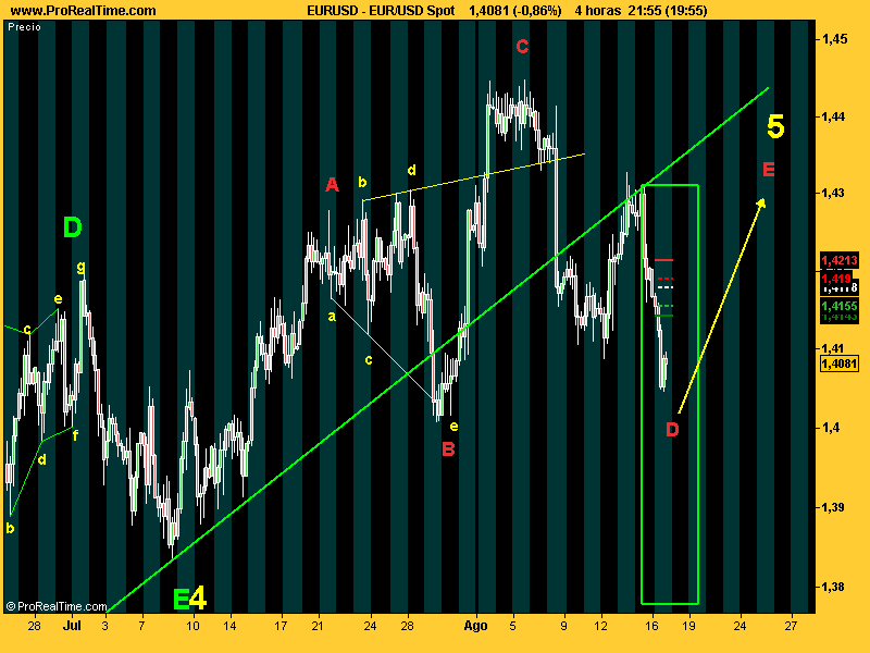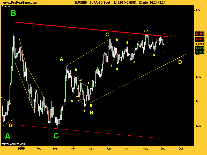 y puesto en plan pragmático viene a decir que la onda D ha de ser más larga que la b en precio, lo que nos llevaría a más allá del 1.4850 como mínimo...creo yo que no hay que pensar en el giro mientras no toque la línea paralela...