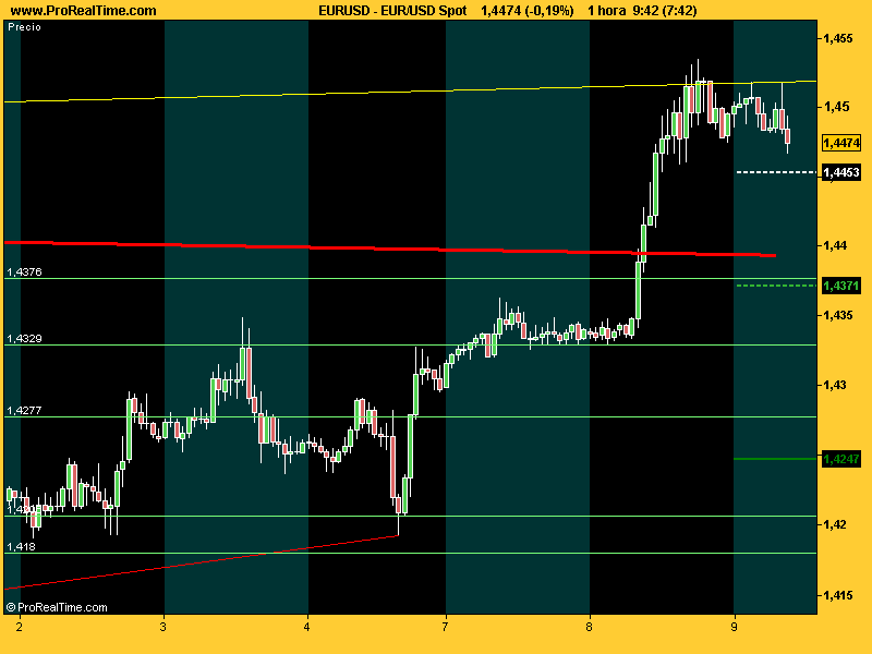 Aquí pongo un zoom del horario donde podemos observar como "aleatoriamente" el precio se vuelve curiosamente cada vez que toca la línea amarilla esa de la que hablábamos ayer...pero no olvidemos que esto es aleatorio y el hecho de haberlo "profetizao" no es sino consecuencia del alcohol y la suerte