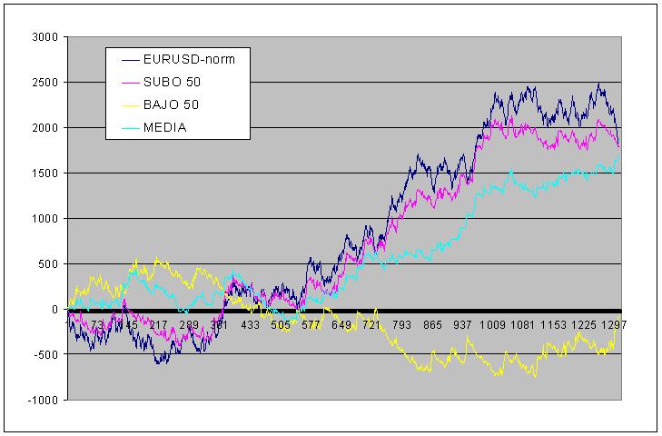 La curva azul es la normalizada del eurus. La rosa es la del resultado acumulado con estrategia del Labou de SUBE 50= GANO 50. Como podeis ver……, a menos que me haya salido mal el excel del labouchere….. (que todavia no he pillado el fallo), cuando sube gano y cuando baja pierdo…., aunque haya acumulacion de resultados.
