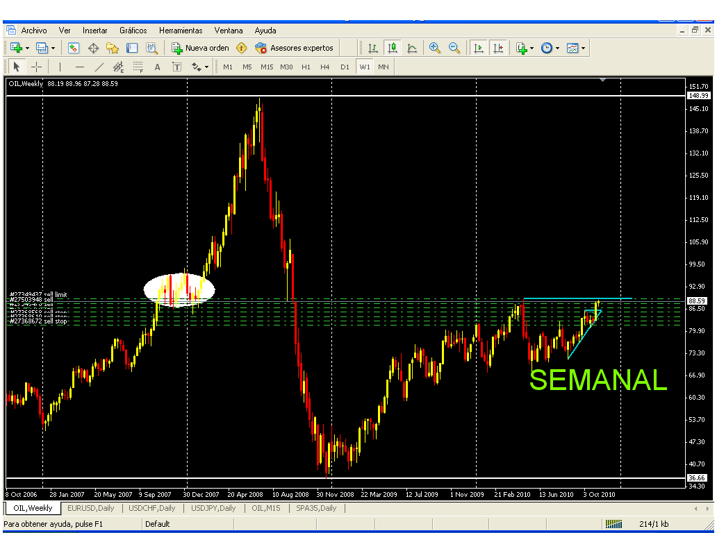 Dicho esto, me parece que estamos a miercoles, mitad de la semana, el Oil, todavia esta sin decidirse para donde ir (esta esperando a el eurus), asi que... nos pondremos un profit de 91 dolares para todas las divisiones (las que estan puestas actualmente en el grafico), y... las divisiones de reserva que guardamos, las pondremos de dolar en dolar (cinco divisiones por cada dolar) a partir de los 92 dolares, pero... en sentido contrario, asi que nos llegara todo hasta los 96 dolares (en sentido descendendente).