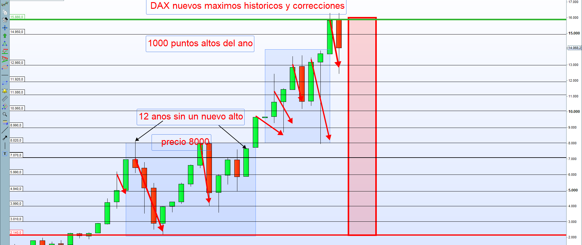 Adjunto grafico anual del DAX. Se observa que tras un nuevo alto anual el precio corrige por lo menos 1000 puntos.