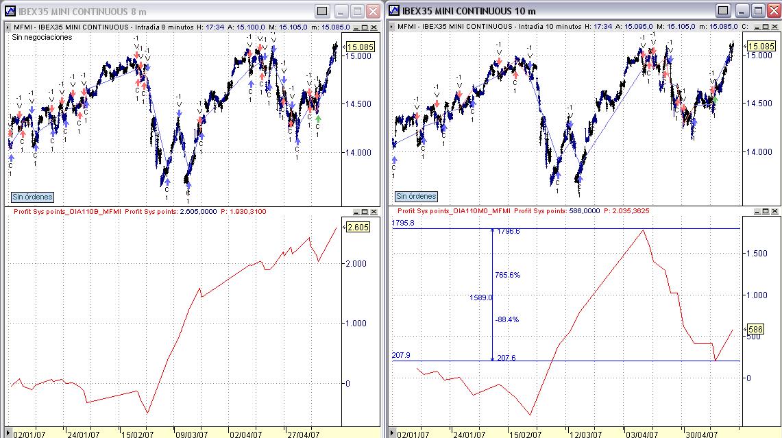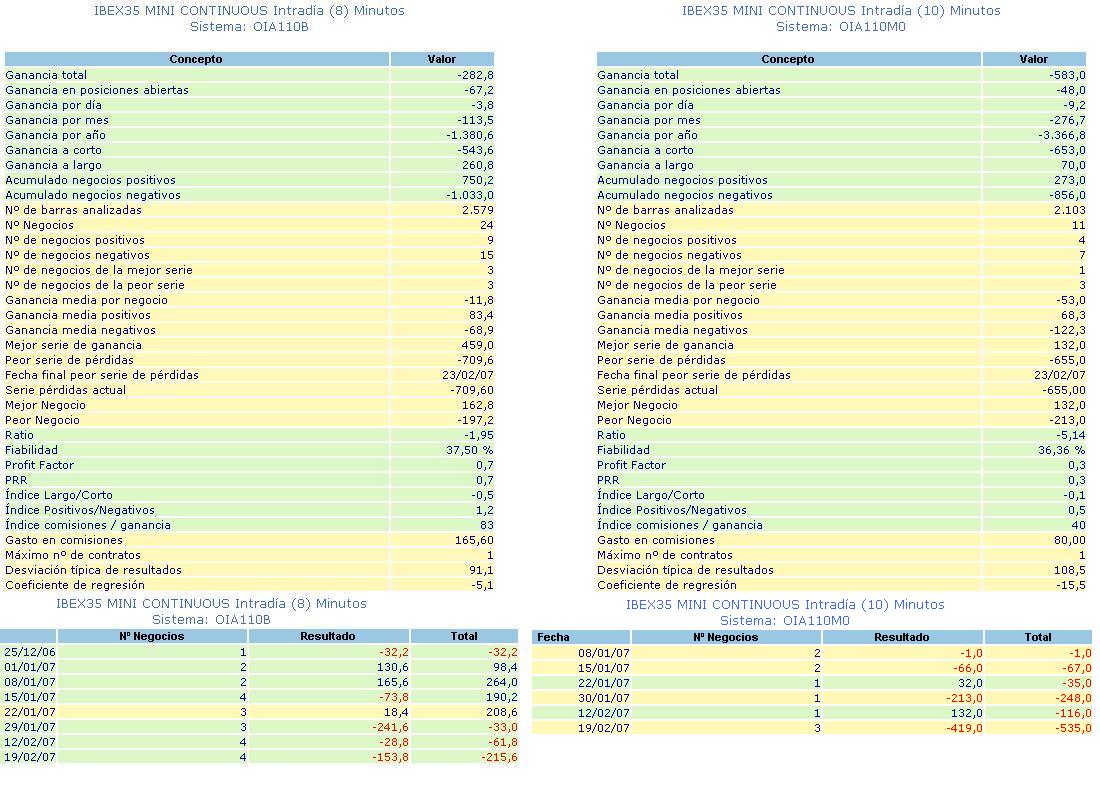 De mi operativa no se puede decir precisamente que fuera provehosa, más bien todo lo contrario, pues hemos entrado en una fuerte serie de pérdidas con uno de mis sistemas, el 110M concretamente, que a pesar de intentarlo, no  da pie con bola desde hace ya unas semanas. Por suerte, por pura chiripa diría yo, el otro sistema está en serie de ganancias, lo que minimiza algo el desastre. De todos modos, en la suma global, sale saldo negativo y de bastante!! Añadir que cuando tengo que poner el visual en el ordenador de casa -por festivos- siempre me hago un lio y acabo poniendo los sistemas con parámetros diferentes de los que tienen que ir y por eso tmb me comí alguna operación mala más de la cuenta y fue bastante dolorosa!