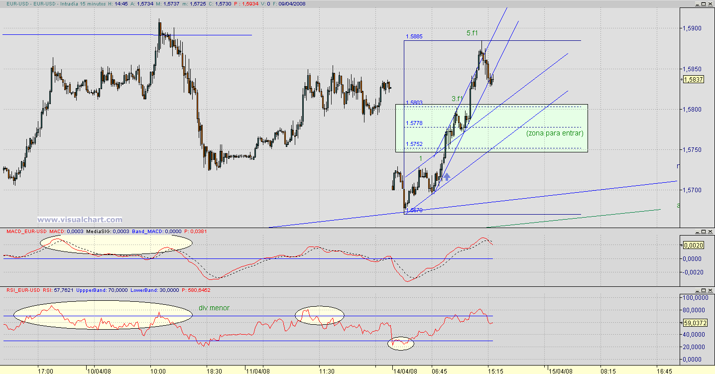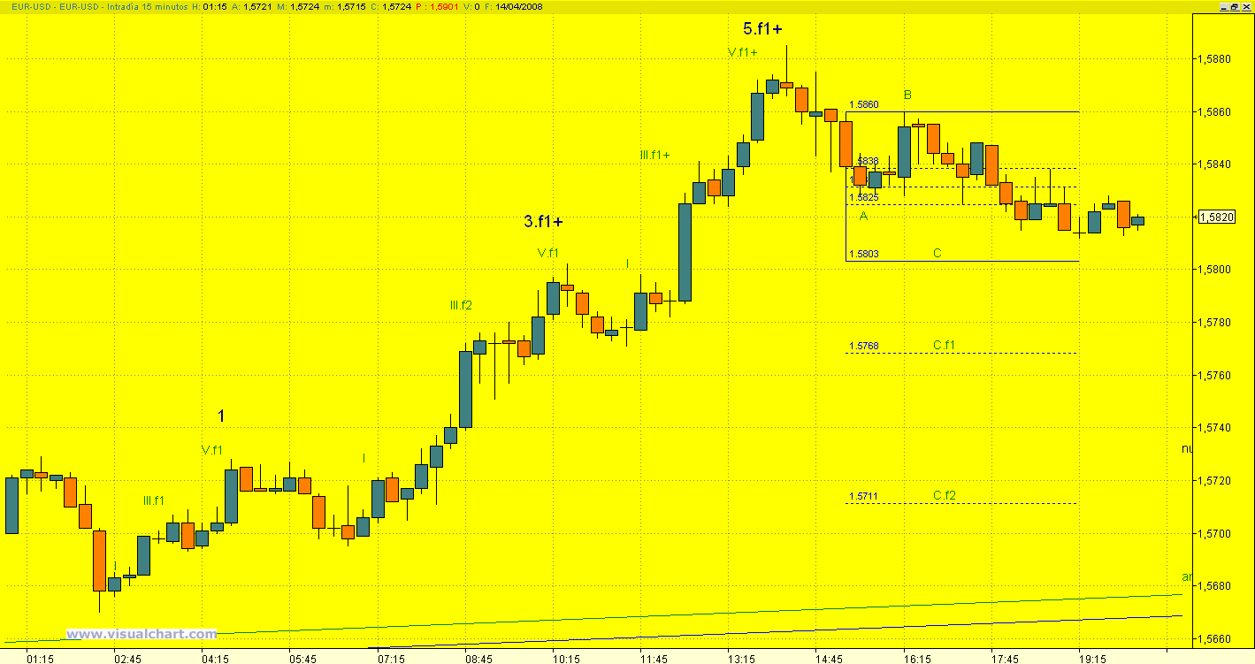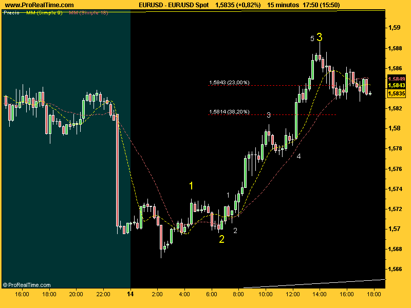 Siento discrepar, pero a mí me paice que lo que está haciendo es una cuarta de manuá que se ve muy bien en 15 minutos. Haría una quinta el 61 de to este movimiento ya que la 1 es demasiao pequeña comparada con la tercera, y después retrocederá. La incógnita es ¿cuánto? teniendo en cuenta que es un primer impulso estadísticamente puede ser bastante. La quinta amás romperá los máximos y cuando empiece a retroceder, más de uno se va a asustar y empujará pabajo. De todas formas yo estoy parriba y el stop lo tengo bajo el origen de este impulso y mientras no baje de ahí no me muevo. Y cuando retroceda el primer impulso compro más yepa. Este triángulo que se bascula hacia arriba anuncia un movimiento majete. Suerttttterufus escribió: Yo diría que acaba de completar un impulso en 5 ondas en toda regla, que es una buena señal de cara a la ruptura al alza. Personalmente me aventuraría a entrar en la corrección de este primer impulso esperando la ruptura al alza con el siguiente.