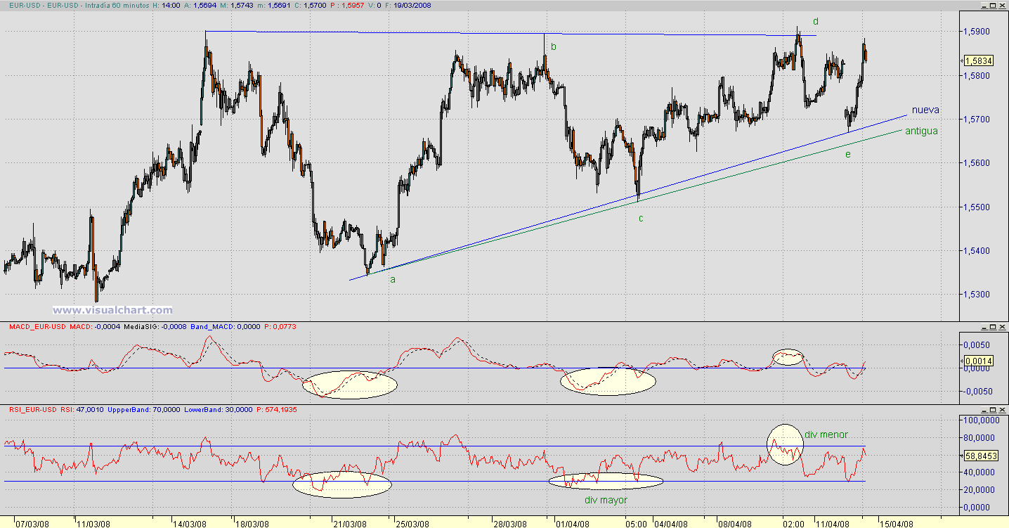 Hombre, la que se supone que va a romper es la b-d si esto es un triángulo como mandan los cánones. La de abajo no serviría más que pa ver dónde se encuentra el vértice que nos da el objetivo de tiempo. Lo suyo es que la válida sea la a-c mientras no se rompa, de la otra forma sería una línea de tendencia mu rara, con un punto en medio que la rompe?????