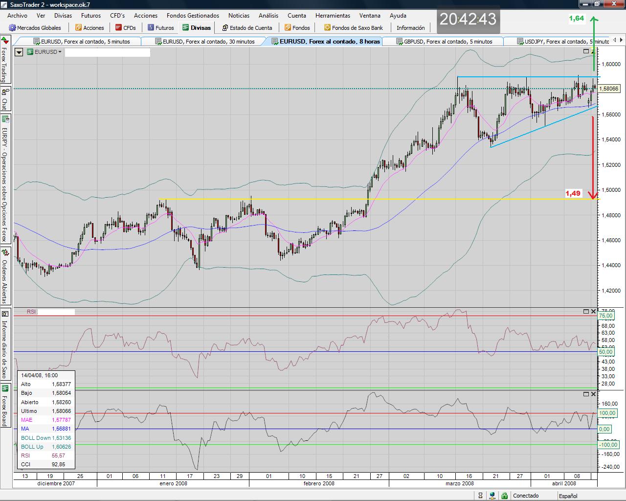 No obstante, parece haber cierto agotamiento tmb, lo ke en caso de confirmarse el mismo y romper por debajo el objetivo teórico sería el 1,49 (a grandes rasgos). El problema de romper por debajo es ke en vez de ir a por el objetivo podría kedarse en un lateral y formar un rectángulo lateralizando mucho tiempo.