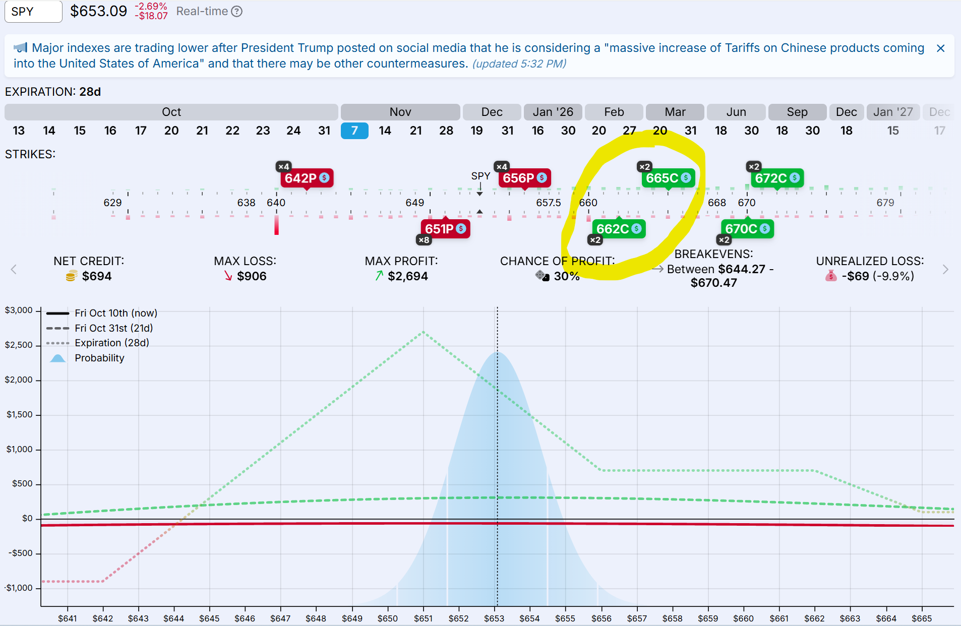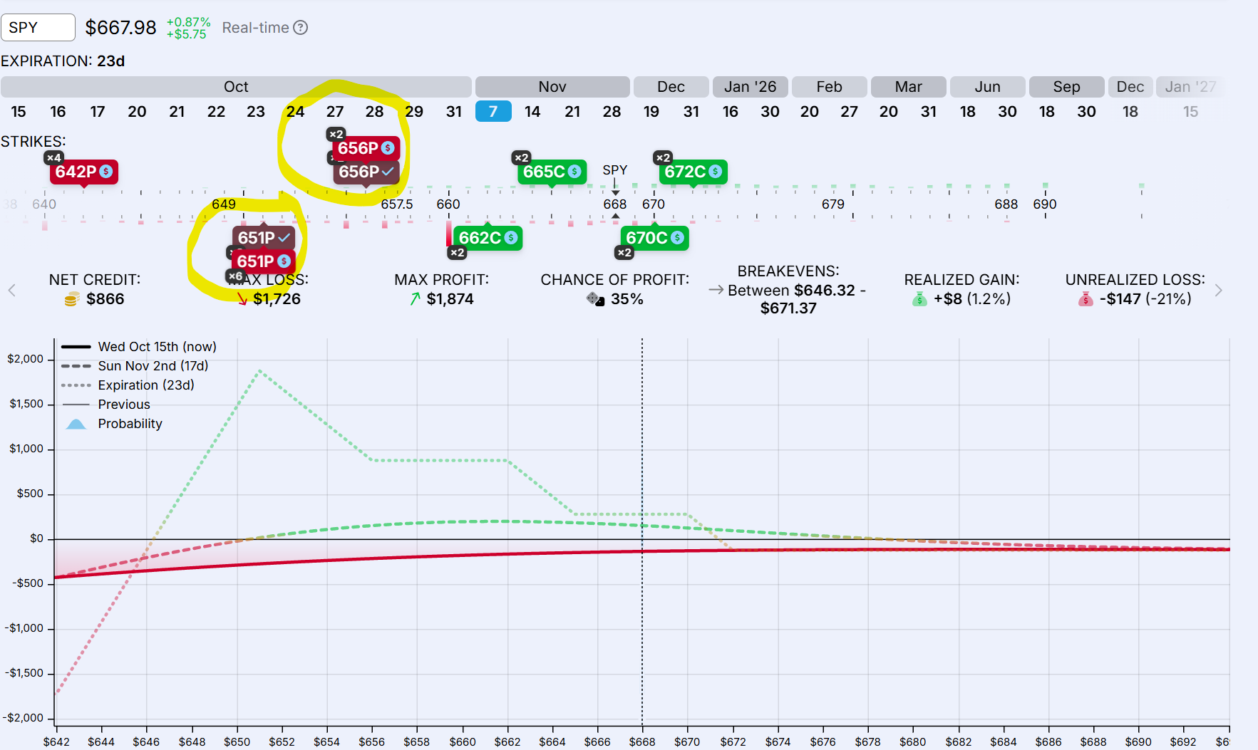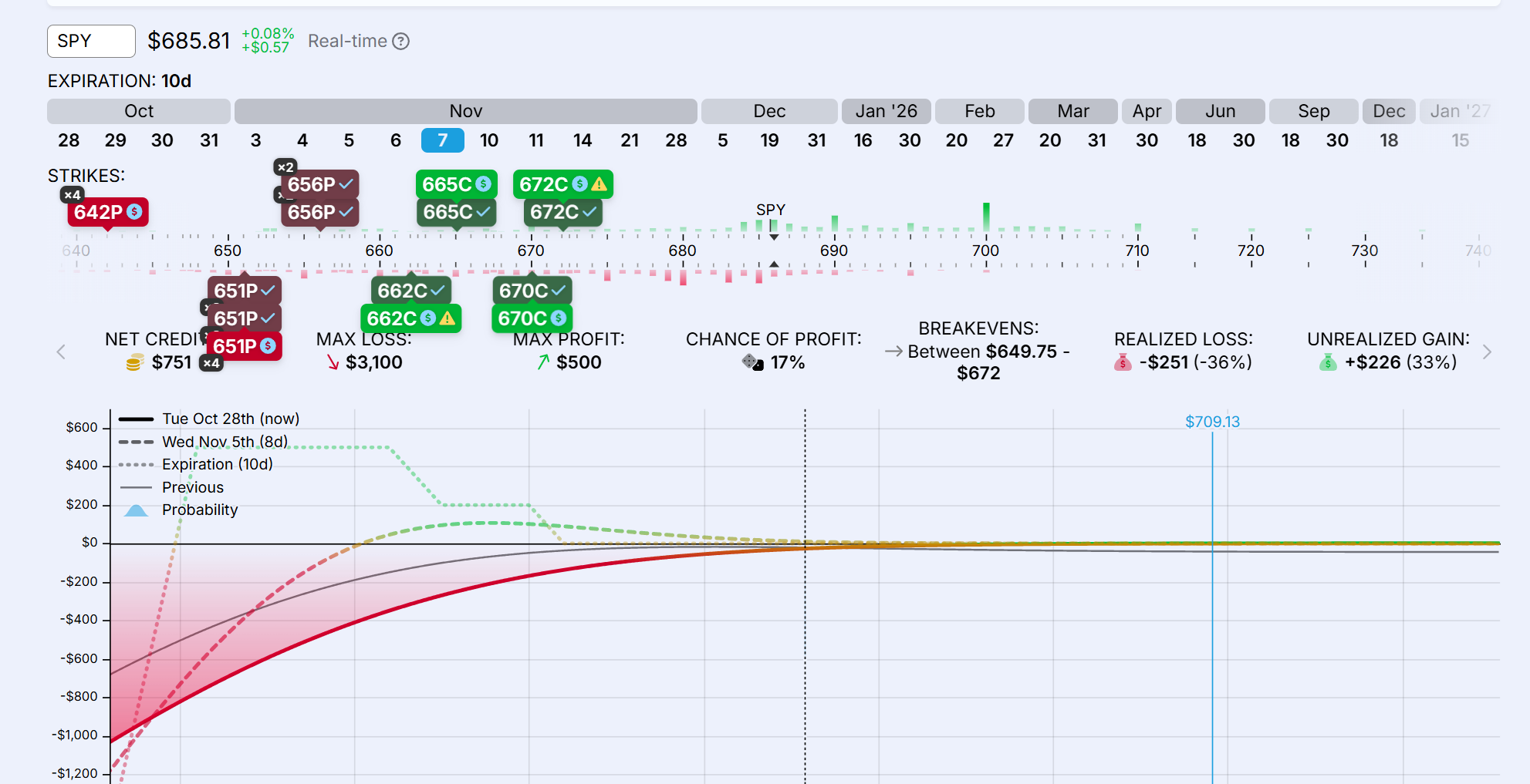 La BWB + BCS ha estado renqueante desde el inicio, en un escenario no muy benigno para este tipo de combinaciones. Siempre se puede ir ajustando utilizando o recomprando los spreads como palancas. Lo último ha sido recomprar dos BCS y preparar la estructura para que el alza del SPY no nos afecte llegado al vencimiento y salgamos empate, si nada cambia o seguimos hacia arriba. Todavía podríamos hacer algo de dinero si el SPY baja de manera ordenada en los próximos días hasta el rango de $655/$670, aunque como siempre ocurre en estas cosas, no nos vale tampoco cualquier tipo de bajada, sino una que combine precio con el paso del tiempo.