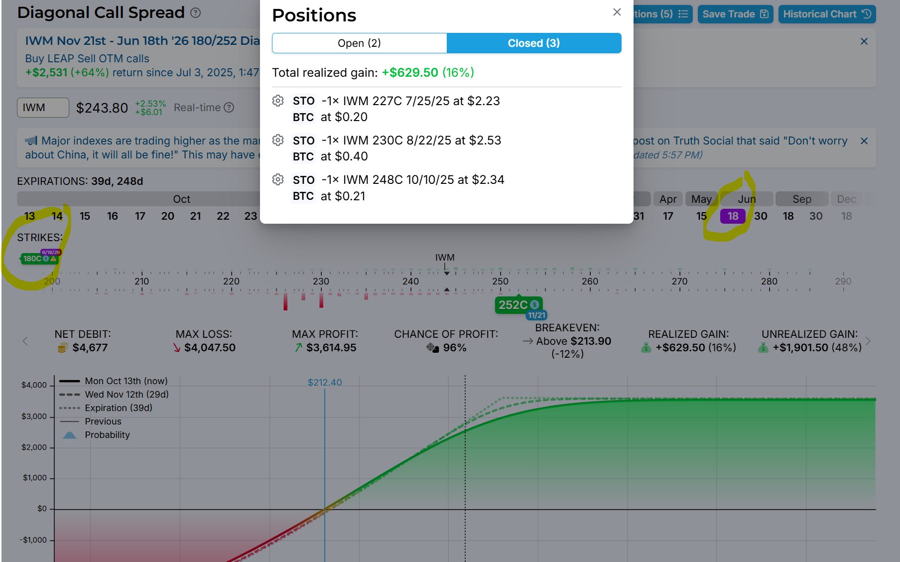 Esa que muestras la llevas muy bien. Vas recogiendo primas y reduciendo coste con las ventas y capturando buena parte del movimiento del subyacente en la LEAP. Y si es necesario puedes cubrir y proteger la ganancia con bear put o long put dependiendo la caída que anticipes. Buen trade.