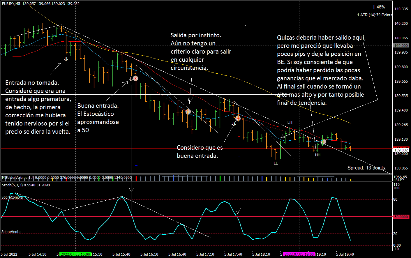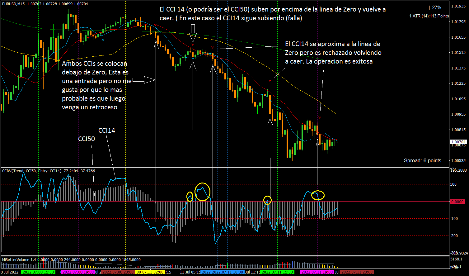 - entrada con 2 posiciones, una la liquidas, si es posible, con beneficio/perdida 1:1 y la siguiente posición la mantienes usando el cci 14 de la siguiente manera,: cuando supere 0 y vuelva a entrar por debajo de 0, colorar el stop en el máximo de ese tramo.
