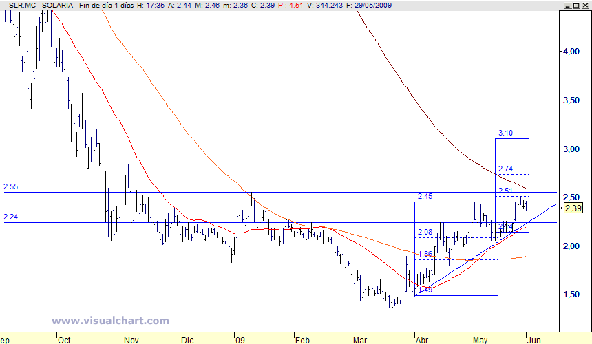 Ha iniciado un segundo impulso con objetivo en 3.10, pero si pierde la tendencia se convertirá otra vez en un primero, la media de 200 sesiones pasa cerca de la resistencia de los 2.55, esperaremos nuevos acontecimientos, si lo miraís en gráfico de 5 días se observa un lateral claro.-
