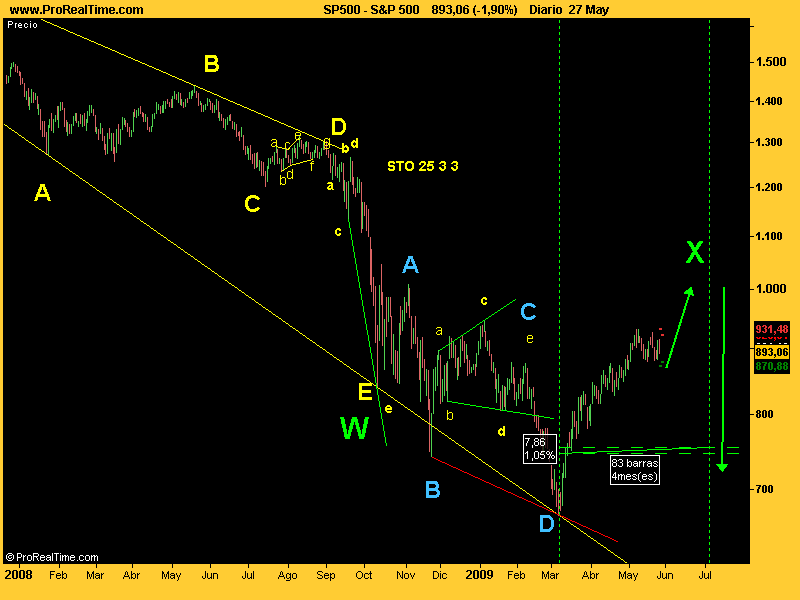 La cosa es que ha hecho un ABCDE (triángulo) que llamo W en verde. Ahora hace otro ABCDE expansivo al que llamo X en verde y se supone que es contratendencia, pero como veis es lateral más que alcista este movimiento, con lo que se supone que el siguiente movimiento que falta pa completar las 3 partes y llamaremos Y cuando pinte :D será bastante fuertecillo porque no hay demasiada fuerza alcista en esta figurilla...