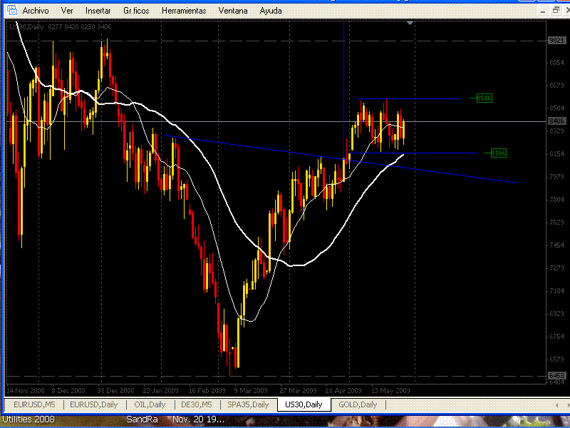 Hoy he ganao, Si Señor. Esta mañana le saque 55 puntos al ibex en un pis-pas. Asi que el resto del tiempo, lo he dedicado a ver lo impredecible que es la bolsa y lo facil que es; explicar los graficos pasados