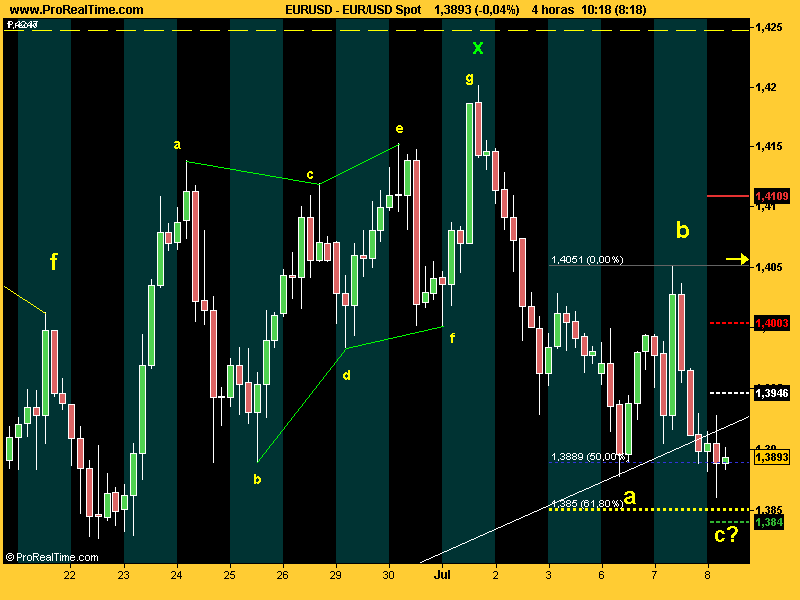 Xactamente ha hecho una onda A (o está haciendo y baja un poquito más, pero poco, vaya) y yo creo qu va a hacer un triángulo. Si es ese el caso no bajaría del mínimo de hoy, pero todavía es demasiado pronto para afirmarlo. Cuando se vea hasta dónde llega este próximo rebote, u sea, la onda b, pues ya podremos echar unas hipótesis jeje.