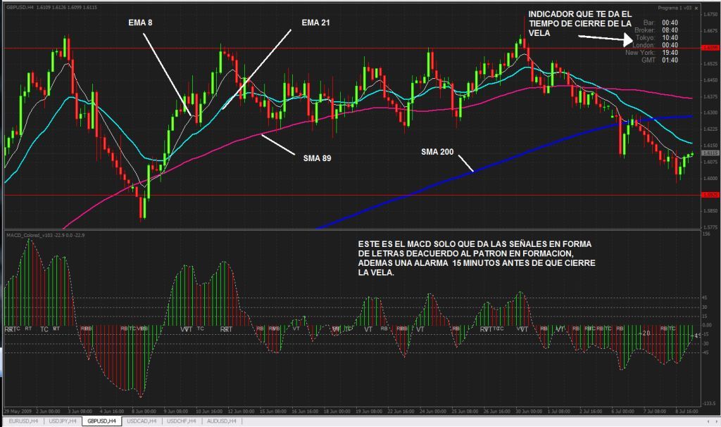 Encontre que la EMA de 21 se acomoda mejor al movimiento reciente del precio (Mirar este sistema viewtopic.php?t=11225 en el sistema de 5 minutos Phillip hace un excelente uso de la EMA de 21….que no es la excepción en este sistema,, yo ya la se manejar…y es muy buena para saber donde serán los rebotes en tendencia). La SMA de 89 da a conocer la dirección de la tendencia, cuando el precio esta encima de esta el sentimiento es alcista, mientras que si el precio esta por debajo el sentimiento es bajista. La SMA de 200 integra en si la interpretación media de las noticias para largos periodos. La EMA de 365 es la de mas largo termino pero le da mas peso a la información reciente, debo admitir que esta EMA no juega un rol muy importante. hay en algunas ocasiones que el precio la prueba luego de haber pasado por todas las otras medias móviles por eso la uso.