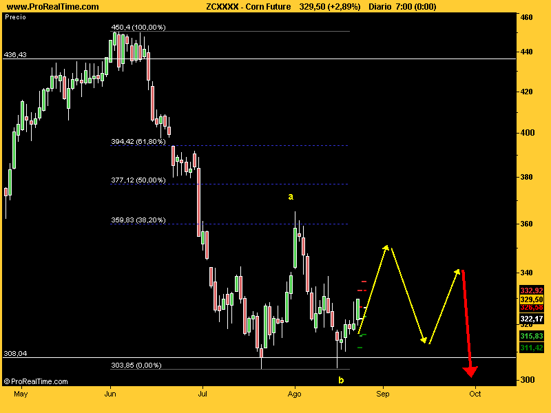 El corn ha roto hoy su directriz bajista más inmediata después de hacer un nuevo mínimo anual el 18 de agosto en el 302. Si el recuento fuera correcto deberíamos ir a buscar niveles de 450.