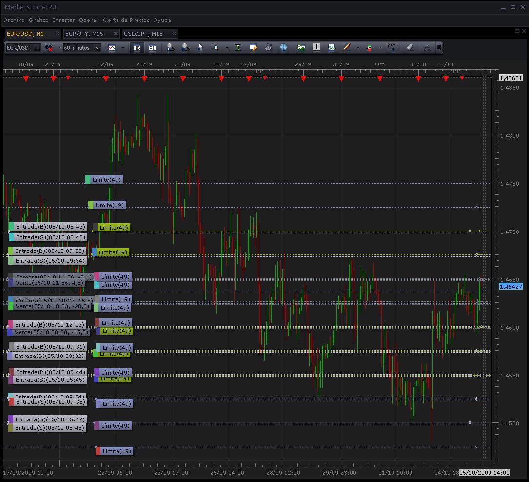 Los limites los tengo (ire cambiandolos a lo largo de la semana) entre 1,44 y 1,48, mientras no se me acerque o se pase de estos limites yo ire sumando pipos de ganancia (mientras pase mas de 2,5 veces por cada sitio en promedio)...