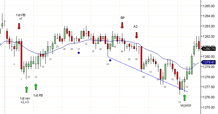 El mercado se movió por encima del doble tope en la vela 38 y trató de fallar dos veces en las velas 42 y 46. Esto también fue un movimiento en tres empujes en un canal y actuaría como cuña. Si esto se disparaba y fallaba, existía la posibilidad de un movimiento proyectado de 5 puntos hacia arriba. Pero el precio se movió en contra de los compradores dos veces y una salida debajo de la vela 53 era apropiada. La vela 56 dio una oportunidad de A2 en largo y esta fue la última operación razonable del día. Las velas 73 y 74 formaron una posible bandera final (FF) o un doble tope (DT) pero de acuerdo al comportamiento del día es mejor dejar pasar dichas operaciones cerca del fin de la sesión.