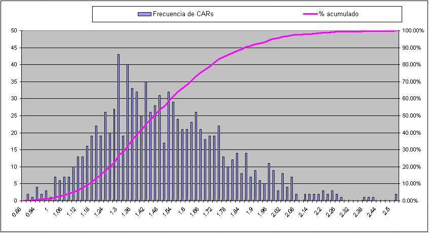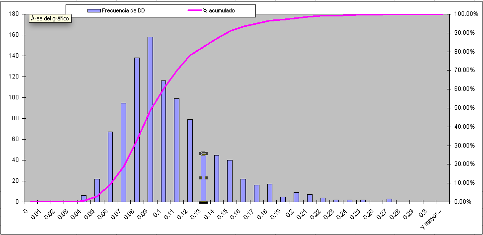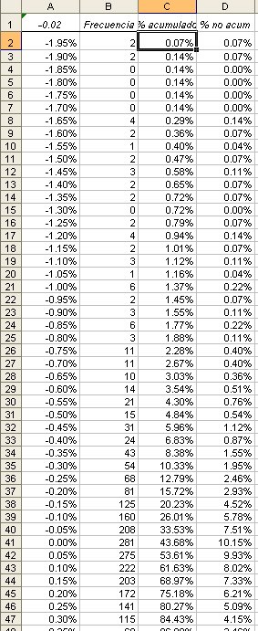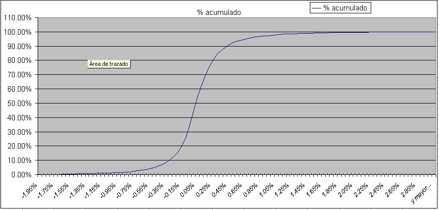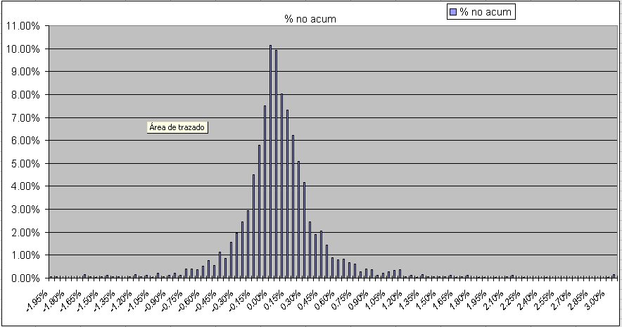 Para ello, usamos la utilidad de Excel "histograma", dando un rango de datos que son todos nuestros trades, y un rango de clases, que son el detalle de rentabilidades que queremos graficar. En este caso, indicaremos que deseamos ver las ocurrencias de 0,05% de beneficio.