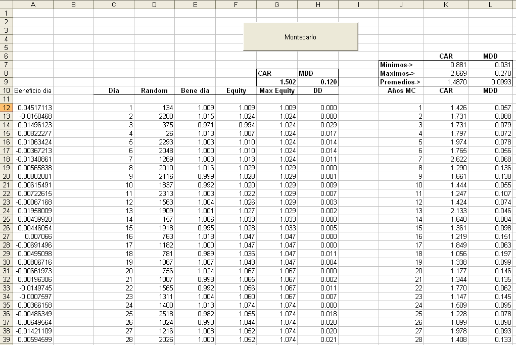 Los datos se pueden exportar de nuestro software de backtest e importar en Excel, simplemente con la fecha del trade y el valor. Los datos exactos pueden ser el beneficio en euros del trade, o el beneficio en % respecto a la inversión de de ese mismo trade, o en resultados de la equity, bien en dinero absoluto, o en porcentaje, o en resultados de la equity a fin de día, en dinero o porcentaje.