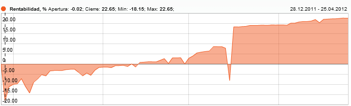 Sobre el capital inicial esto viene a ser una rentabilidad del +36,90%. Currensee muestra una rentabilidad del +40,8%, pero esto en un principio lo atribuí al método de cálculo, aunque ahora dudo si no será un problema de que no grafica bien, los "NA" que he comentado antes. Pero si en realidad calculamos la rentabilidad sobre el capital que ha habido en la cuenta en cada momento si que tiene que salir una cifra mayor que el 36,90% que es la rentabilidad sobre el capital inicial. Por ejemplo si descontamos del capital inicial los 890 euros que se han sacado de la cuenta (está mal, pero nos da una idea) la rentabilidad que obtenmos es del 44, 94%, como la cifra que ofrece Currensee está entre las dos (36,90 y 44,94), pues ayer no sospeché que pudiera estar mal. De hecho si hacemos los cálculos con precisión calculando la rentabilidad para cada periodo entre retiradas de capital, la cifra tiene que ser muy cercana a la que ofrece Currensee.