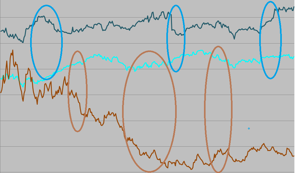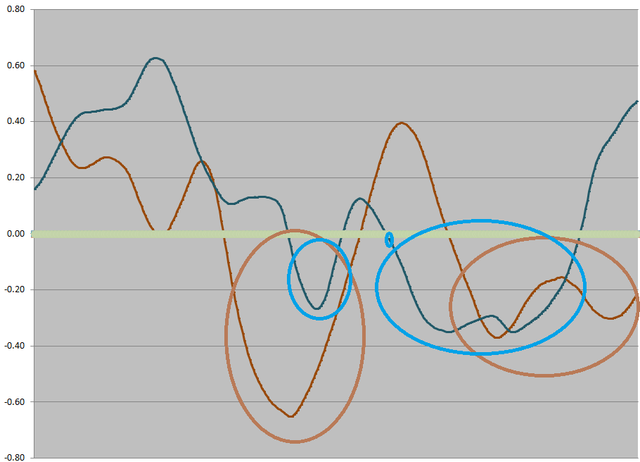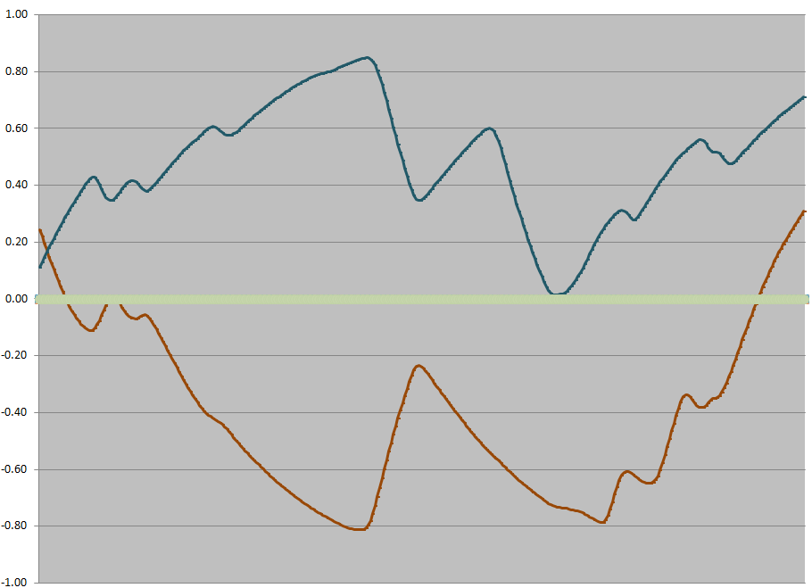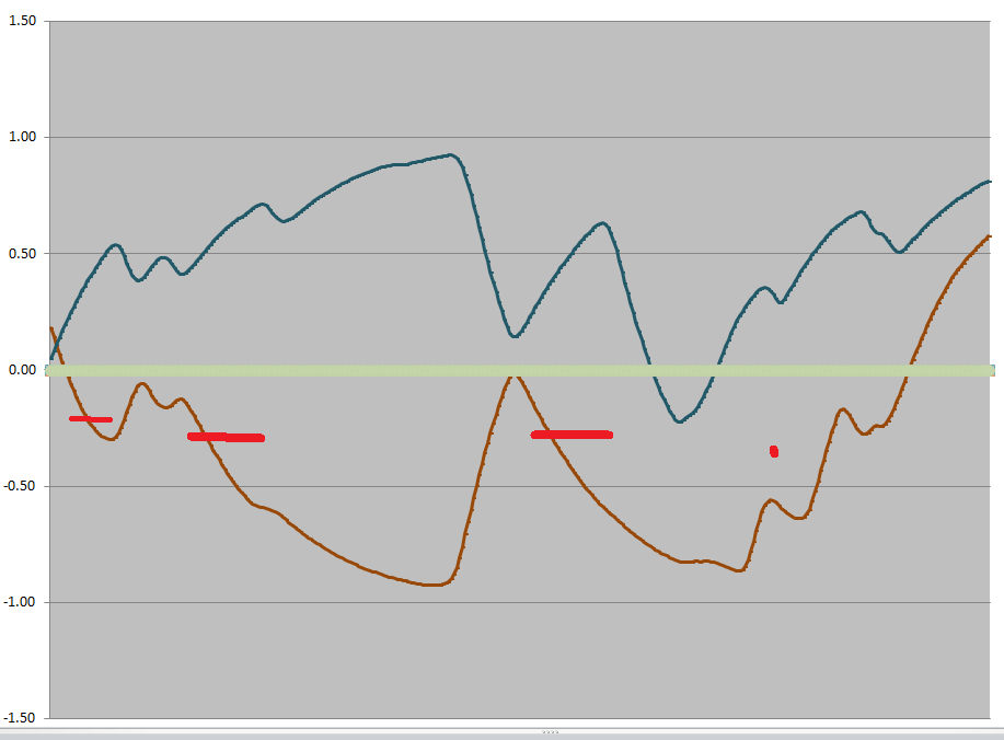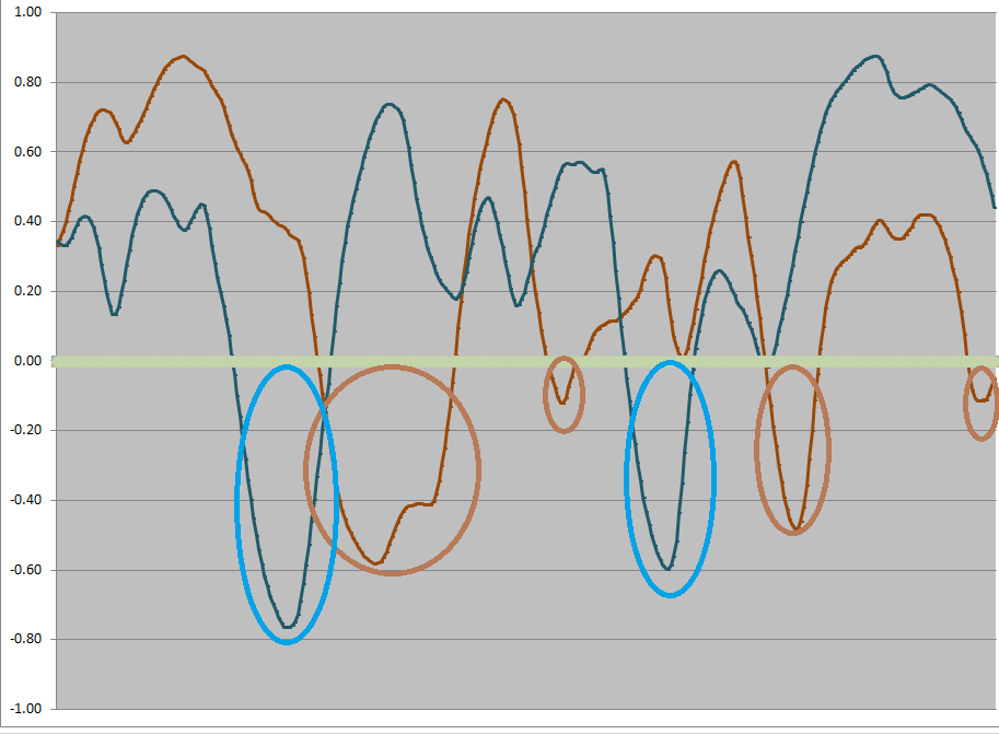 Después de varias horas...escogemos unos parametros que nos den una información clara de lo que estamos buscando. Obeservamos que el activo azul guarda una correlacion alta con el benchmark por contra el activo marrón guarda una correlación negativa respecto al benchmark. Y podemos gestionar una información valiosa a la hora de tomar deciones, por ejemplo activos con una correlación por debajo -0,20 vender (siempre que tu sistema te lo indique, estamos sólo haciendo zonas de correlación no un sistema propiamente dicho) en relación con el benchmark, gráficio ejemplo;