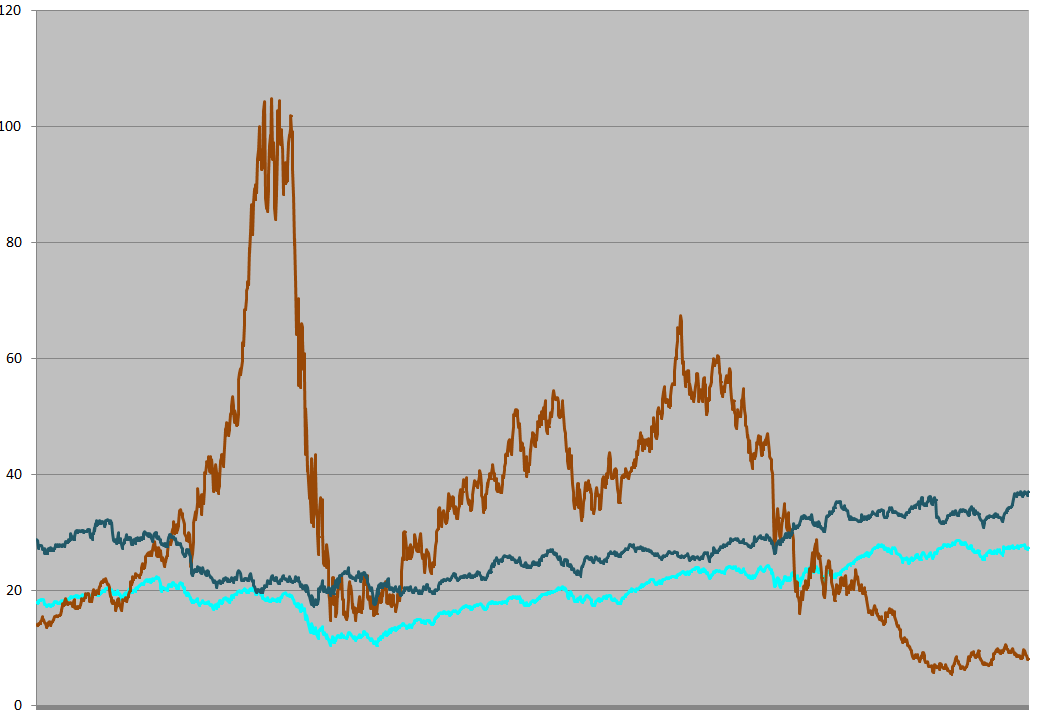 Continuamos, en el grafico nº 2 (correlación de retornos de 15 días) observamos que las correlaciones se mantienen altas por encima de o con lo que no tenemos una información útil para gestionar, en el grafico nº 1 observamos que si hay movimientos que atraviesan la linea 0 de correlación pero que son insuficientes para determinar una información en la toma de decisiones, ya que se muestran los valores cuando empiezan los movimientos de descorrelación o correlación negativa en la parte alta de la correlación (valores por encima de 0,40 de media) con lo que la información útil nos la da prácticamente al final del movimiento, con lo que es ineficiente.