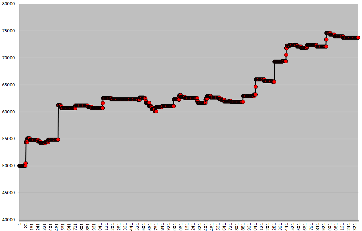 El proceso es el siguiente, cojo una cesta de 10 valores al azar (que reunan las condiciones que exijo) y les aplico el sistema con una distribución de posiciones en balance. No miro si las condicones de gestión son las adecuadas para cada valor respecto a la cartera ni una selección en tiempos muertos, únicamente compruebo la pontencia del sistema y la distribución dado unos valores al azar.