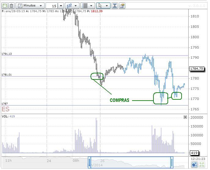 Para la sesión de hoy día 28, vemos que la zona entre los 1767 y 1781 ha sido muy interesante, y parece que ha habido compras. Sería bueno ver el precio por encima del 1781, y poder ver si nos subimos a largos en alguana corrección.