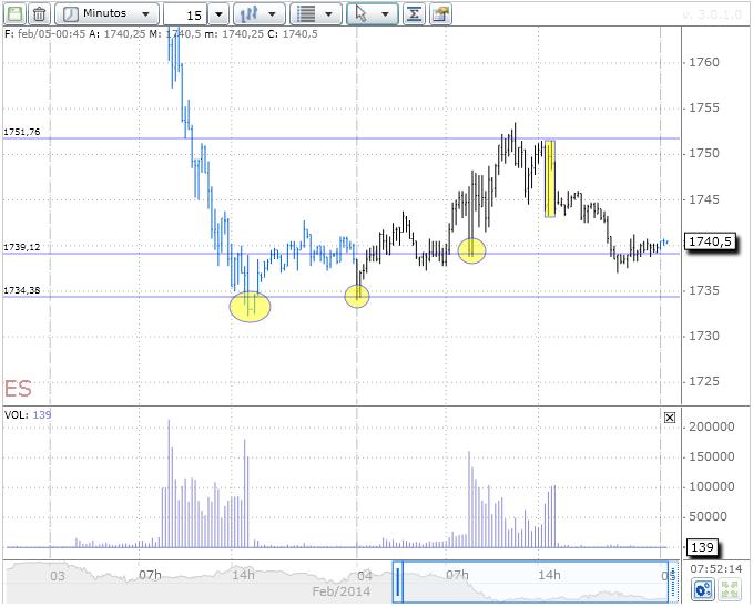 Así visto es posible que veamos al mini sp en el 1722 o 1710 en breve. Haciendo un zoom en 15min, para preparar un poco la sesión de hoy, vemos los tres círculos amarillos ascendentes. Zonas de acumulación que le hacen corregir, hasta que la distribución del rectángulo amarillo, le obliga a volver a los 1739, zona dónde se origina el último impulso alcista. Si quiere siguir subiendo, no debería de perder las zonas del 39 y 34.