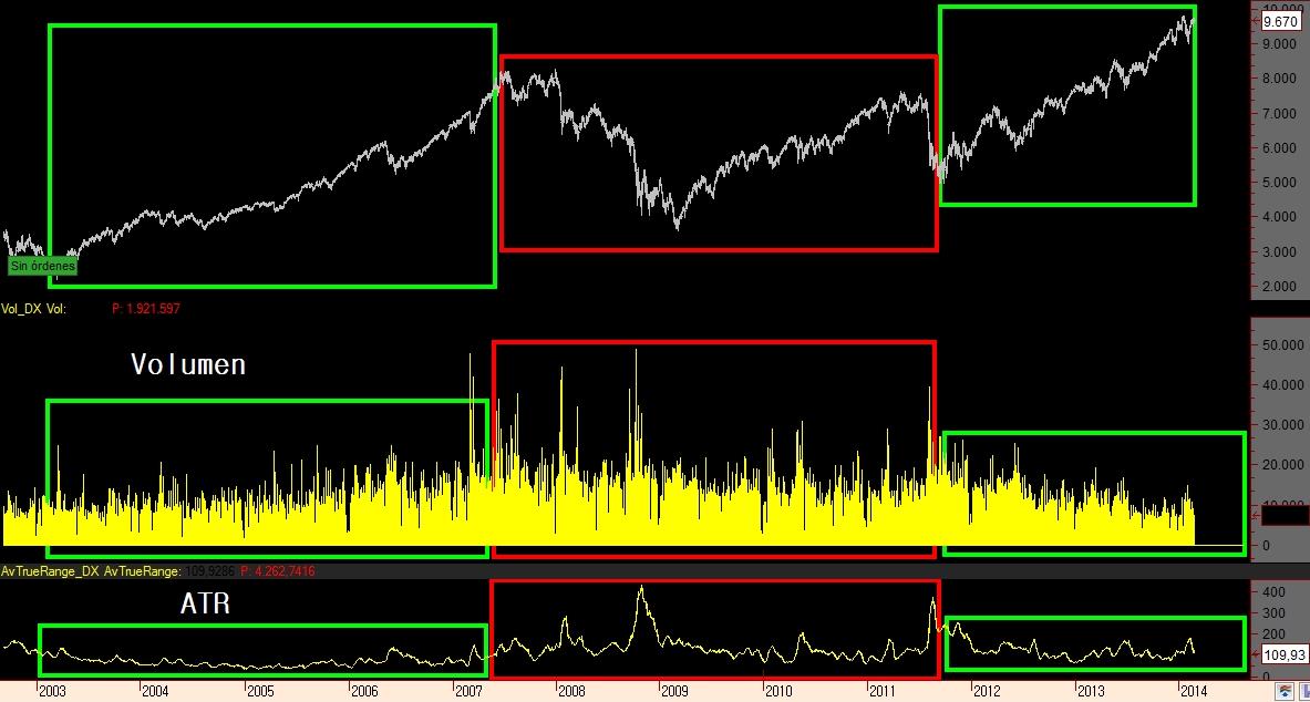 Quería abrir este nuevo tema porqué me preocupa un poco el volumen del futuro del Dax-30. Lleva ya tiempo haciendo un poco el panoli, muy a la baja, concretamente desde que empezó el verano del 2013, creo recordar que sobre el mes de julio. Mis análisis personales revelan que la media de contratos diarios del futuro del Dax-30 desde 2006 (01/01) hasta 2011 (31/12), ambos inclusive, fue de 166.000. El año siguiente, el 2012, cayó hasta 140.000. Este último año, 2013, la media se redujo hasta los 103.000 contratos por día.