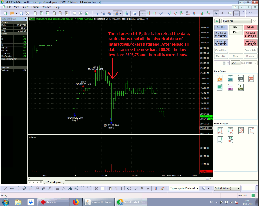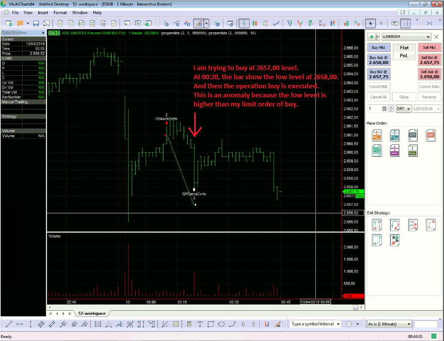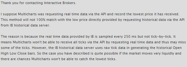Entonces con MultiCharts hago Control+R, que recarga datos históricos, y veo que el precio realmente si ha llegado a tocar mi nivel. Lo comento a IB y me responden esto: Me dicen que envian datos cada 250ms y por tanto puede haber movimientos muy rápidos que no lleguen a quedar reflejados.