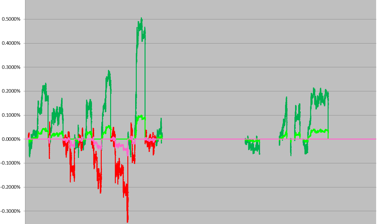 Llevo un par de meses, intentando buscarle sentido a la operativa intradía, desde un prisma programable, resulta muy complicado crear un marco de decisiones que se pueda adaptar a la tipología cambiante del mercado, mi manera de hacer las cosas implica que la propia génesis del sistema adopte los cambios por sí mismos, algo bastante complicado y que choca frontalmente, con herramientas de ajuste y optimización ya existentes y que siguen criterios más lógicos, dado la complejidad de la adaptación.