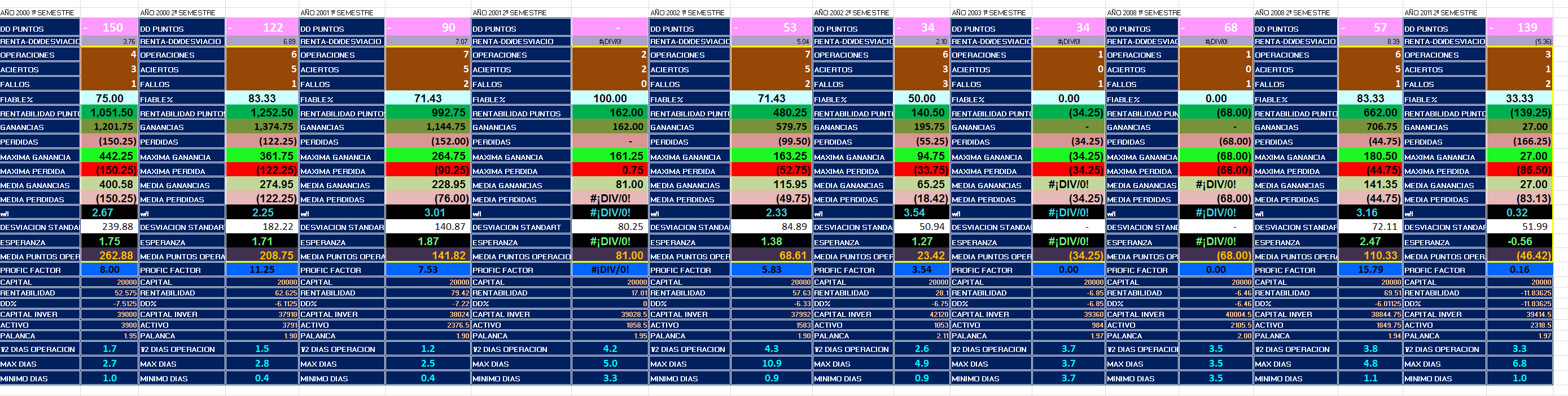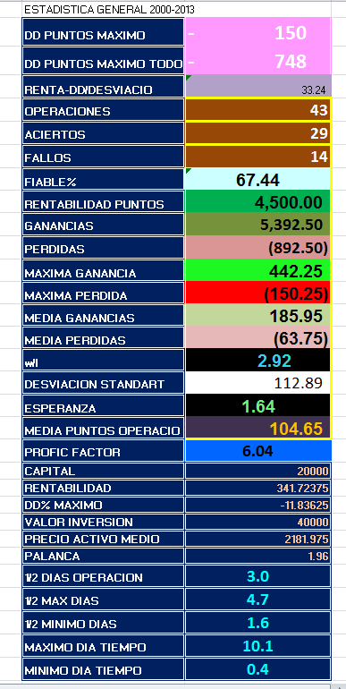 Respecto a lo que dices, de las pruebas que debes tu hacer para que lo consideres de alta probabilidad, te digo que los ratios de este sistema para el tipo de sistema que es , son una autentica barbaridad y espero una caída del rendimiento de un 20%, por errores de operativa y posibles desajustes, aunque de momento no detecto estos posibles desajustes, ya que funciona bien con varios activos y una prueba de fuego fue el año 2008 que deje como out sample y consiguió perfectamente su cometido en comparación de los años 2000, 2001, 2002, pero repito el real es la verdadera prueba y veremos que pasa...quizás lo único a remarcar es que realmente son pocos los años de fuerte mercado bajista, pero como se ha considerado con activos como la plata y el oro y alguna materia prima aunque existen diferencias notables ha conseguido mantener la lógica del sistema, que eso es lo importante aunque hayan diferencias en los ratios estadísticos por el tipo de activo.
