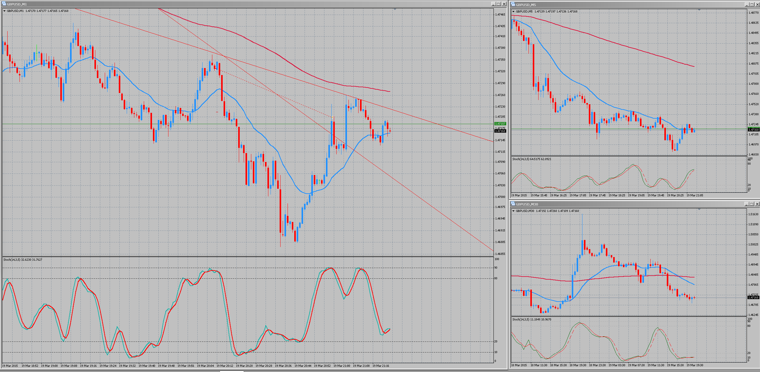 He entrado corto en Gpb-Usd a las 20:12 Por que? Porque M30 y M5 me marcaban tendencia bajista, en M30 acababa de cruzar la media 25 a la 200 hacia abajo, el precio estaba a punto de llegar a un alto de la tendencia bajista, por lo tanto me espero que la bajada sea mayor, miro en M1 y veo un fuerte angulo en el cruze del Stoch hacia abajo dentro de 80-90. Vendo