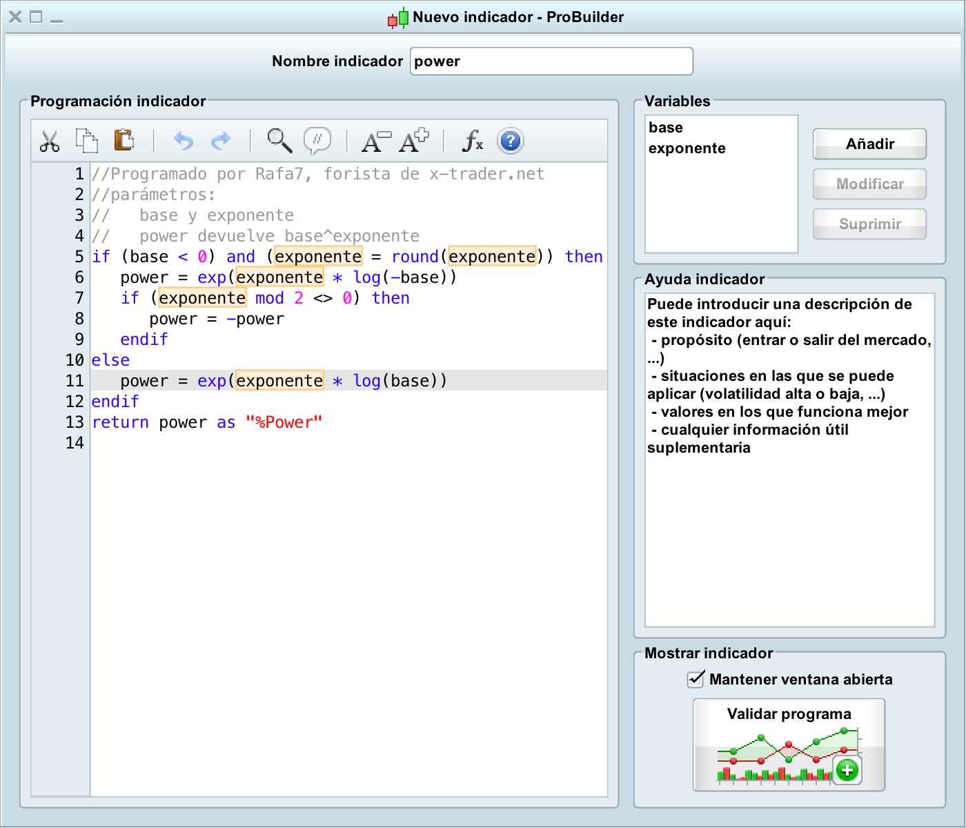 Ahora es más que una teoría. Lo he programado y probado. Al indicador le he llamado power. Con dos parámetros: base y exponente.mascara escribió:Es una teoría nada más...
