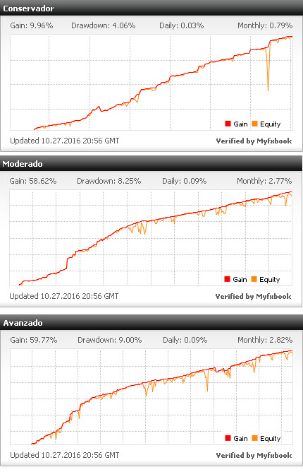 Son Martingalas. Fijate en el conservador la bajada que ha tenido de equity. El DD del 4% es por operaciones cerradas.